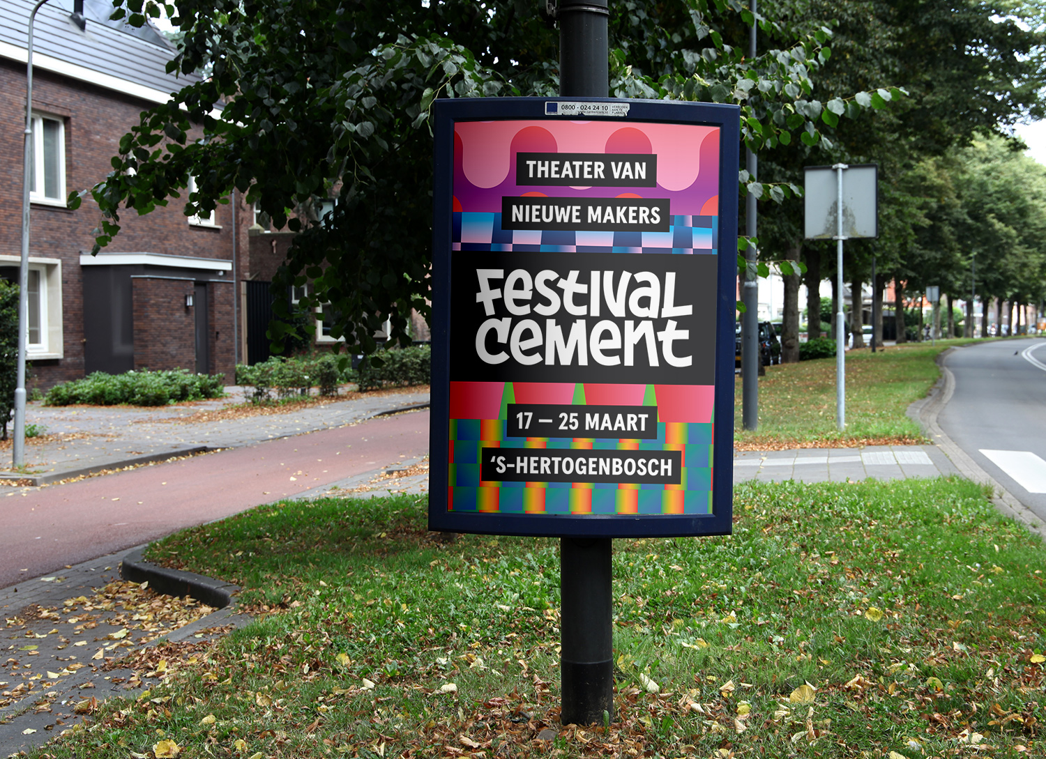 Campaign and identity for Festival Cement 2023. Festival Cement is a nine-day theatre and performance festival taking place in ’s-Hertogenbosch. Every year about 20 young makers from the Netherlands and Flanders show their work to a curious audience. Spread over 9 days, an average of 100 performances can be seen. Website in collaboration by The Cre8ion.lab.