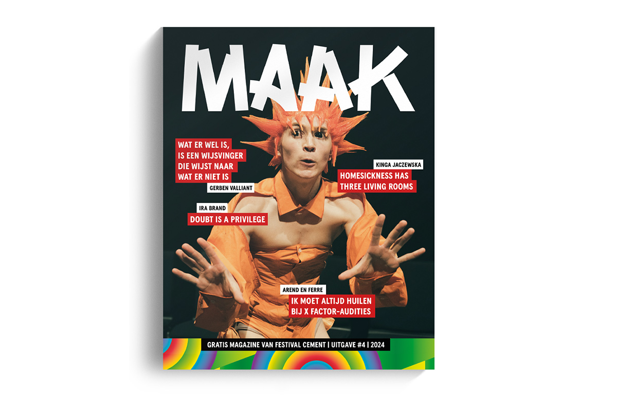 Editorial design for Festival Cement 2023 and 2024. The spreads are taken from the forth edition of MAAK Magazine. In this free magazine all the participating artists, theater makers, choreographers and play writers are presented to the festival public through photography, illustration, articles and interviews.